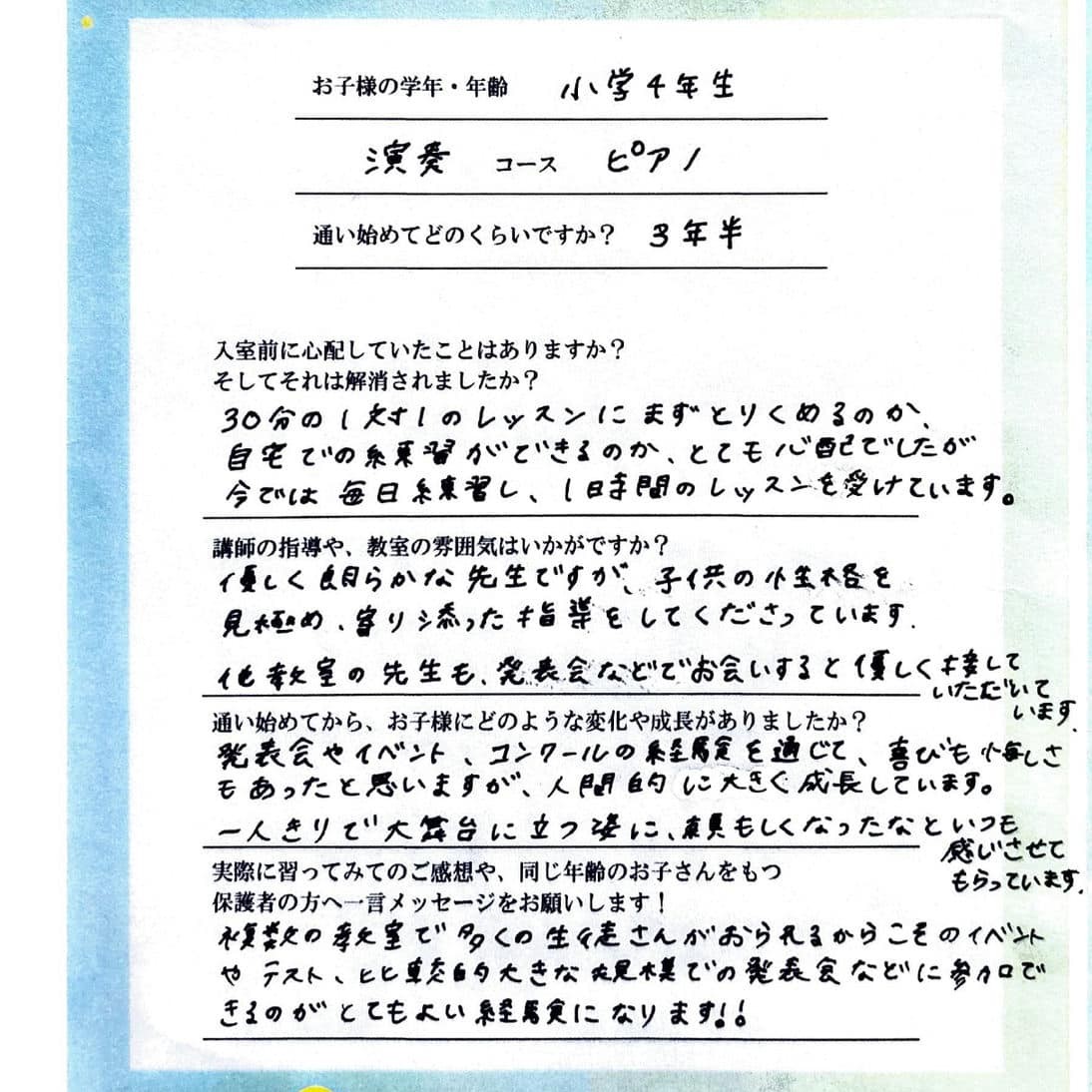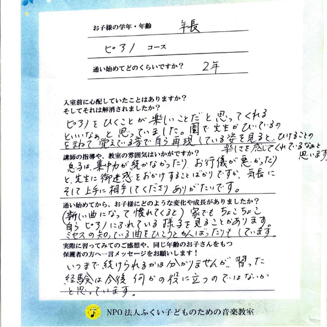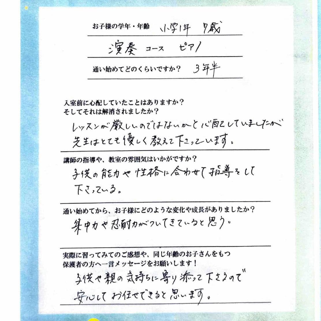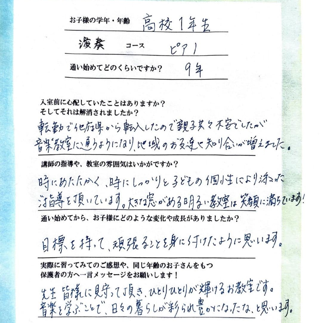練習が大変な時もありますが、必ず成長するので、見守っていて本当に親も喜びを感じる事がたくさんあります。ピアノだけでなく、色々な心の成長も、その子にあわせて指導してくださいますので、安心して通わせられます!