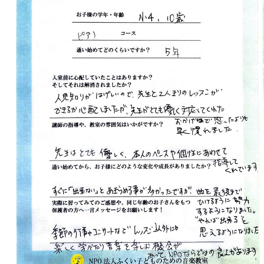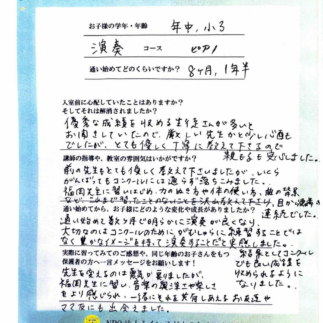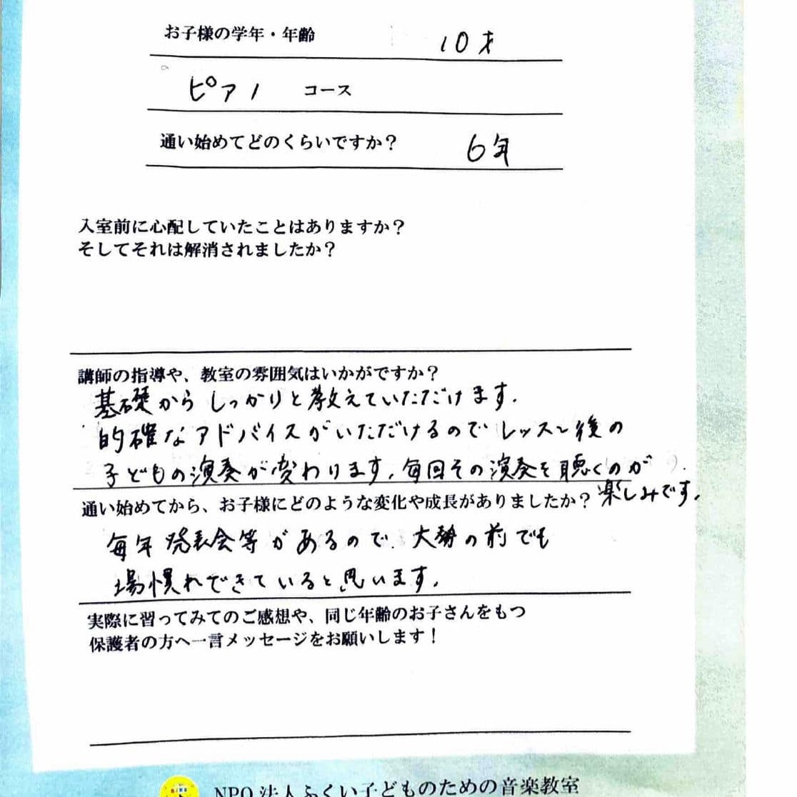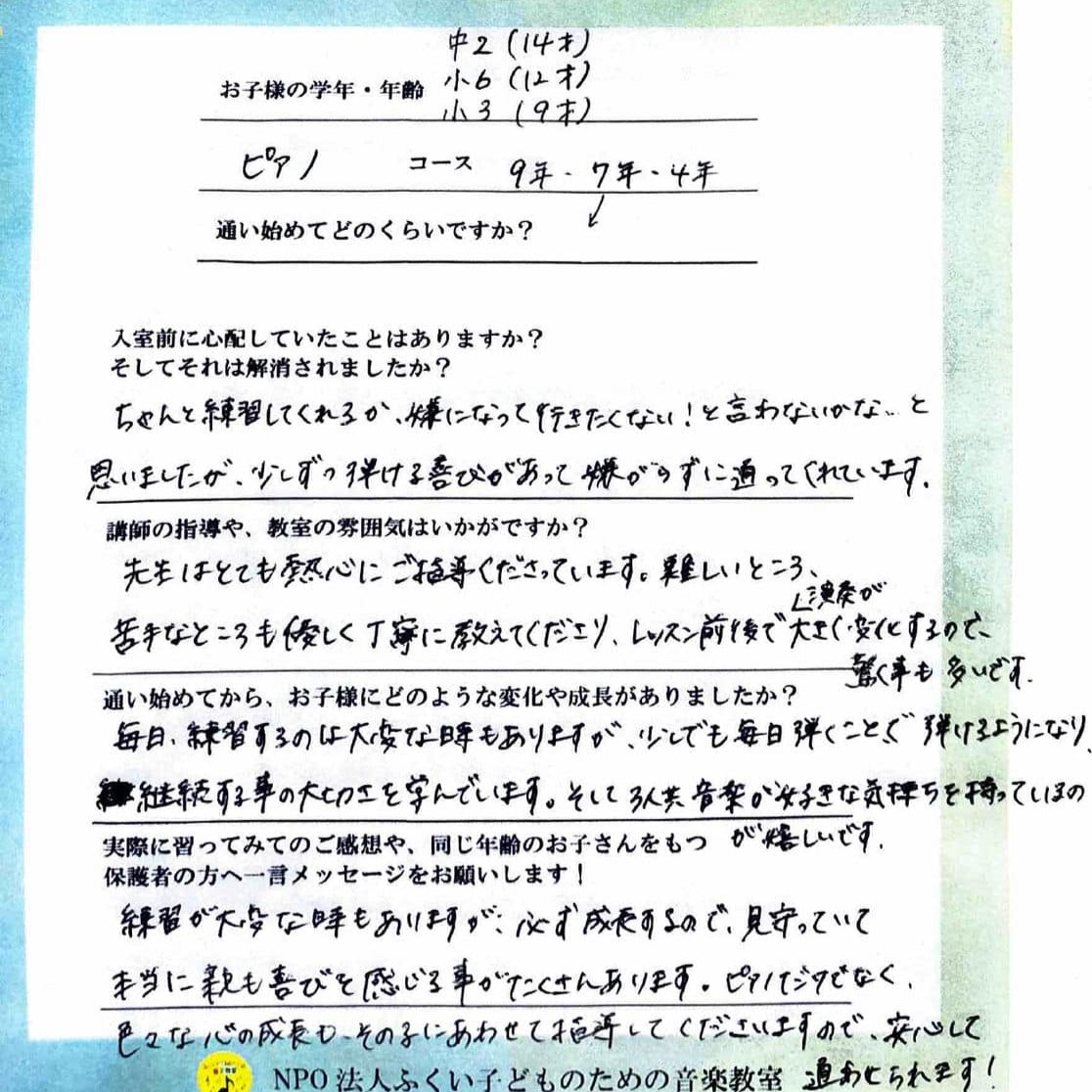 練習が大変な時もありますが、必ず成長するので、見守っていて本当に親も喜びを感じる事がたくさんあります。ピアノだけでなく、色々な心の成長も、その子にあわせて指導してくださいますので、安心して通わせられます!
