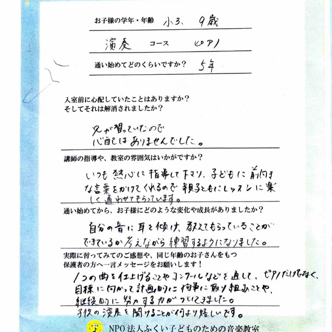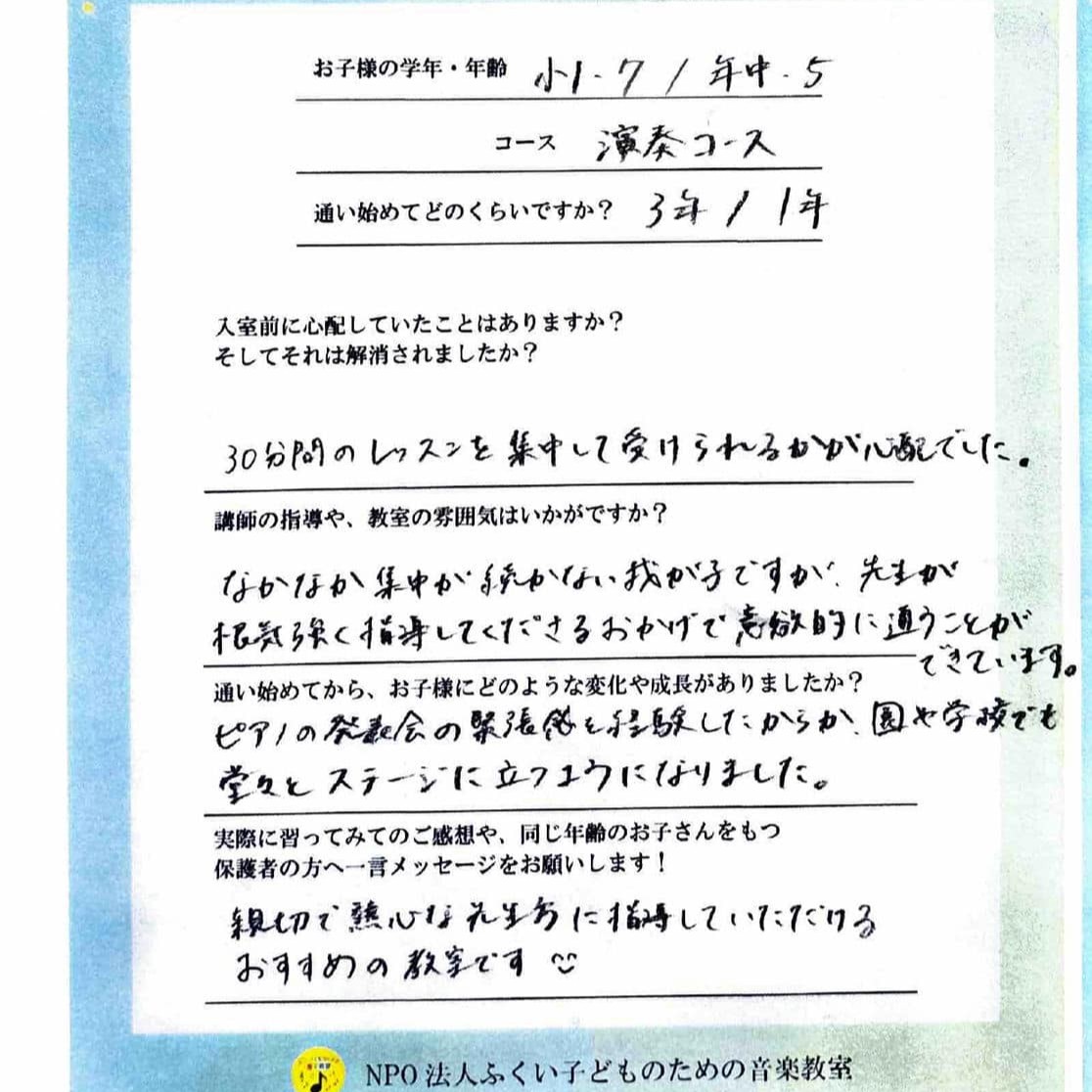 1つの曲を仕上げることやコンクールなどを通して、ピアノだけでなく、目標に向かって計画的に物事に取り組むことや、継続的に努力する力がついてきました。子供の演奏を聴けることが何より嬉しいです。