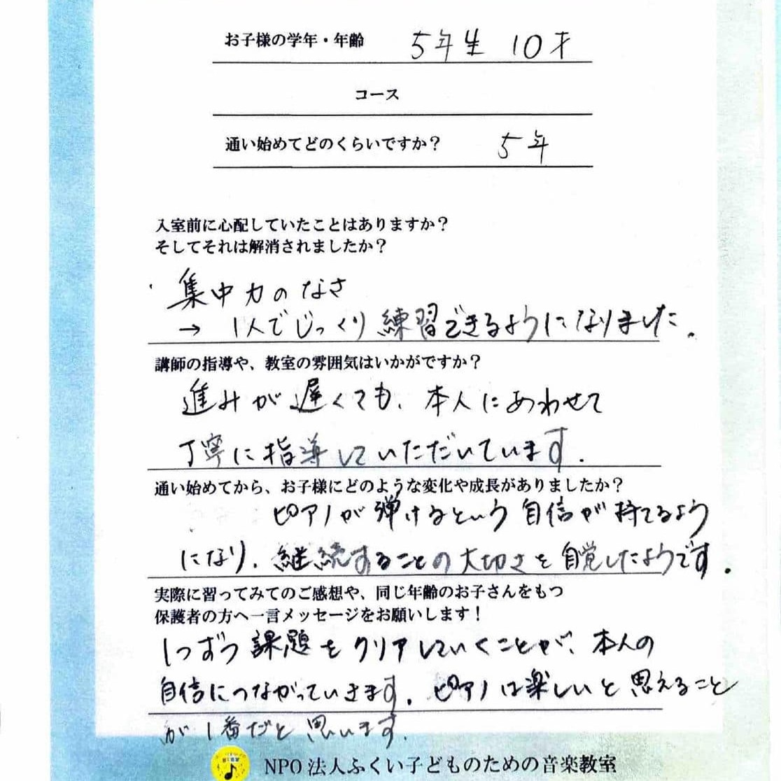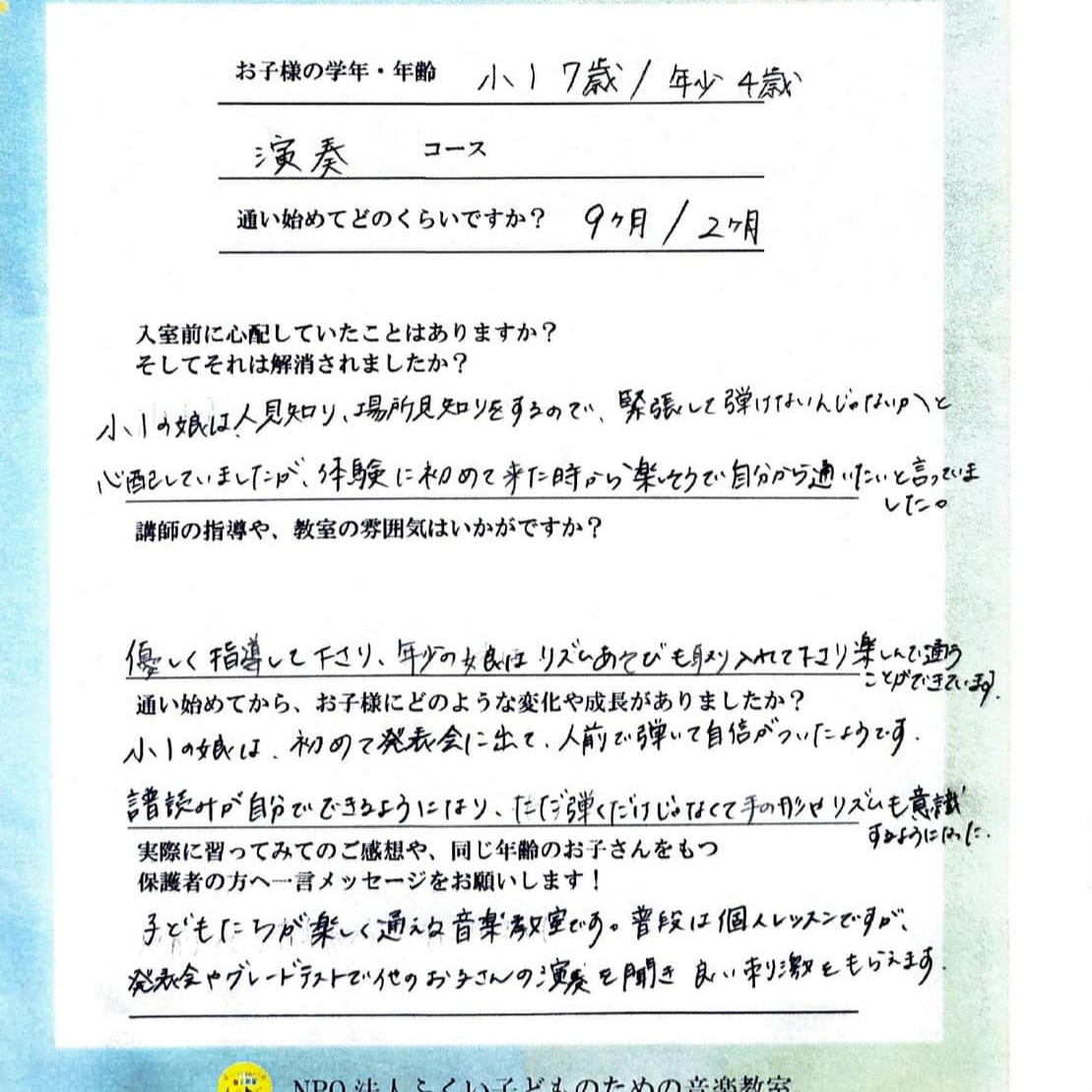 すぐに「出来ない」とあきらめる事が多かったですが、曲を最後まで弾けるように努力するようになりました。”やれば出来る”を思えるようになりました。