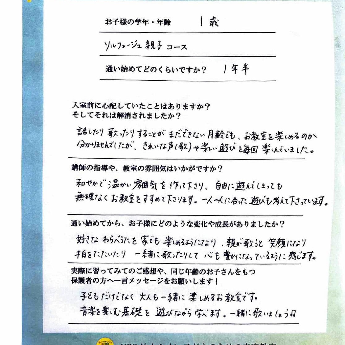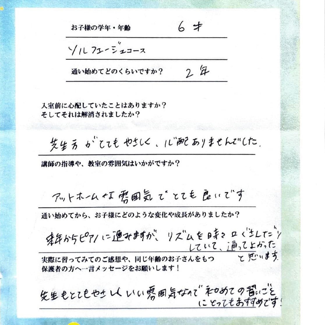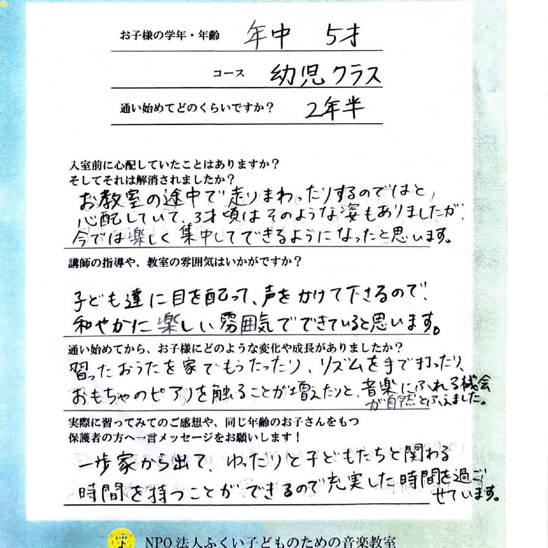 来年から(小学生になり)ピアノに進みますが、リズムを時々口ずさんだりしていて、通ってよかったと思います。